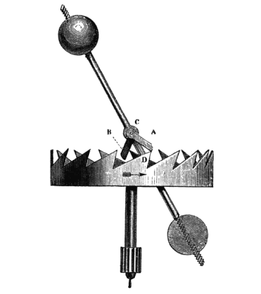 Собаки храпового механизма A, B представляют собой куски стали, прикрепленные к оси баланса С в плоскостях, перпендикулярных друг другу, причем один из них установлен так, чтобы его толкали в одну сторону передние зубья колеса, а другой - в другую сторону. Когда один зуб выходит из своей ниши, другая собака находится в положении, позволяющем принять и остановить противоположный зуб. Но после того, как весы качнулись в направлении, в котором они был вытолкнуты выбегающим зубом, собака не останавливается сразу, а немного поворачивается и отбрасывает колесо, производя то, что называется отдачей. Ваши часы тикают именно благодаря зубчатой передачи, когда шестерня вдруг останавливается в момент очередного блокирования спускового механизма.