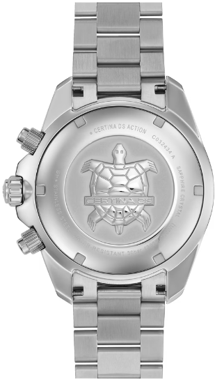 Этот спортивный хронограф, оснащенный однонаправленно вращающимся алюминиевым безелем, с легкостью преодолевает любые испытания. Неудивительно, ведь владельцы этого кварцевого хронометра с сертификатом COSC всегда уверены в точности его показаний. Помимо выдающейся точности хода, он обладает водонепроницаемостью до 30 бар и прочной конструкцией, что делает его идеальным компаньоном в любых обстоятельствах. Вес 180 гр. Для корпуса, браслетов и застежек своих часов марка Certina использует нержавеющую сталь 316L, отличающуюся повышенной износостойкостью, устойчивостью к коррозии и гигиеничностью. В стали содержится совсем небольшое количество никеля, поэтому этот материал не вызывает аллергии при носке. Алюминий отличается высокой прочностью, гипоаллергенностью и устойчивостью к коррозии и перепадам температур. Кроме того, это чрезвычайно легкий металл: он в три раза легче стали и почти в полтора раза легче титана. Благодаря этим качествам марка Certina выбрала алюминий для производства ультралегких корпусов и застежек. Мануфактура использует только анодированный алюминий. Этот особо прочный защитный слой не только делает материал надежнее, но и позволяет окрашивать изделие в разные цвета. Super-LumiNova (SLN) представляет собой cветящийся материал с фосфоресцирующими свойствами. В темноте SLN типа BG W9, который использует Certina, испускает свет в виде голубого мерцания. SLN не вредит здоровью и используется для нанесения на стрелки, индексы и безели. В темноте он через некоторое время теряет свои фосфоресцирующие свойства, но они автоматически восстанавливаются на свету. Сапфировое стекло состоит из порошка оксида алюминия (Al2O3), раскаленного до 2.000 °C. Получаемые в результате сапфировые пласты нарезаются на тонкие пластины, им придают требуемую форму и полируют. Сапфир абсолютно прозрачен, обладает высокой устойчивостью к царапинам и механическим повреждениям. По этим причинам сапфировое стекло стало неотъемлемой деталью концепции DS и используется во всех моделях Certina для защиты циферблата. Хронометр ETA G10.212 с хронографом на 30 минут, индикатором окончания срока службы элемента питания и 1/10 секунды (в режиме реального времени). Счетчик десятых долей секунды повышает престижность любого хронографа: Некоторые модели Certina имеют этот счетчик на дополнительном циферблате у отметки «2 часа». Счетчик активируется нажатием кнопки и автоматически останавливается по истечении минуты, хронограф же продолжает отсчитывать время с точностью до десятой доли секунды. PrecidriveTM - Название инновационной технологии, обеспечивающей исключительную точность хода изделий Certina: Точность часов с кварцевым калибром Precidrive может сравниться с хронометрами. Часы Precidrive с погрешностью до +/-10 секунд в год в 8–10 раз точнее обычных кварцевых часов. Некоторые кварцевые часы Certina – как, например, все модели Precidrive, будь то вариант с тремя стрелками или хронограф – имеют указатель окончания срока службы элемента питания (EOL). Эта функция позволяет узнать, когда завершится срок службы элемента питания: В этом случае секундная стрелка движется с интервалами в 4 секунды, и элемент питания необходимо заменить в течение двух недель. Хронометрами имеют право называться только те часы, которые прошли сложные проверки независимой комиссии и получили сертификат точности. Организа