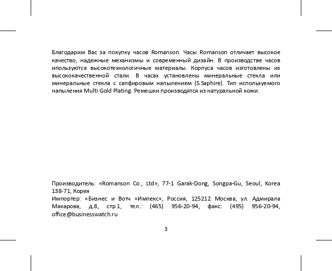 На все часы Romanson, которые Вы приобретаете в салонах или интернет магазине Mystery Time, действует 2-х летняя международная гарантия производителя. В случае возникновения гарантийного случая, Вам необходимо обратиться по адресу, указанному в гарантийном талоне. Обращение в любой другой сервисный центр аннулирует Вашу официальную гарантию.